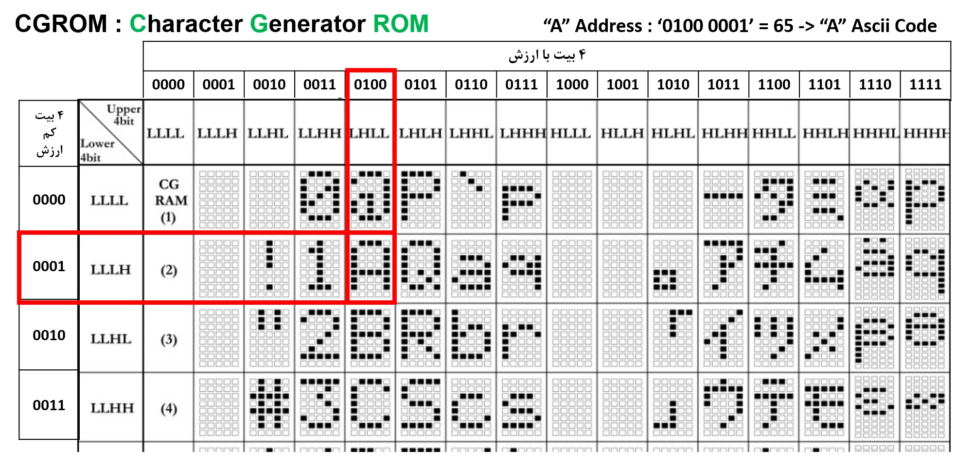 • نشانی هر کاراکتر در یادگاه CGROM ، کد اسکی آن کاراکتر است ، برای نمونه کاراکتر A در نشانی 65 انبار شده است.