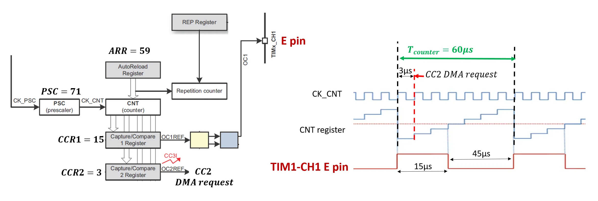• برای پایه ی E از کانال 1 تایمر 1 در حالت خروجی PWM استفاده میکنیم.