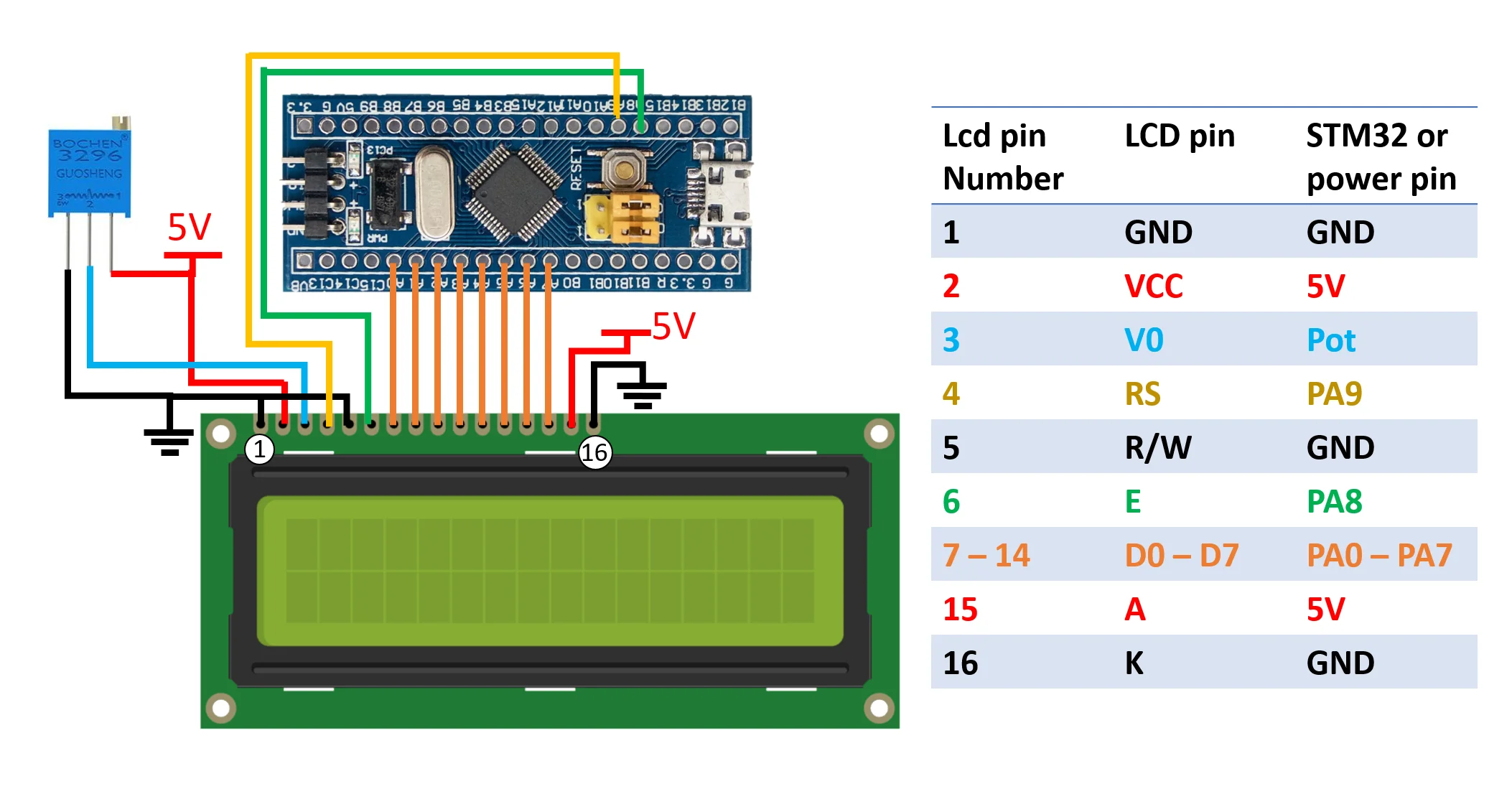 اگر امکانات میکروکنترلر STM32 رو بکار بگیریم. دیگه لازم نیست CPU همه ی کارها رو انجام بده، تنها لازمه عملیات رو آغاز کنه و پس از اون CPU بیکار میشه، چجوری ؟ با تایمر و DMA. اول اینجوری LCD کاراکتری رو به میکرو ببنید .