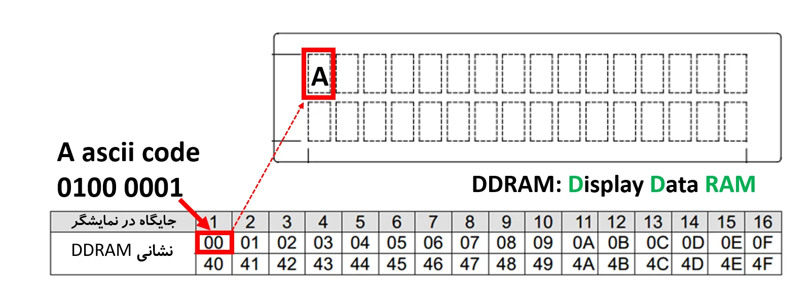 • LCD کاراکتری 16×2 به شمار 32 جایگاه کاراکتر دارد ، برای هر کدام از این 32 تا جایگاه، یک خانه ی 8 بیتی در یادگاه DDRAM هست.