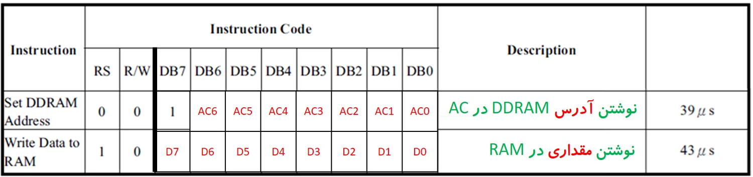• AC0 – AC6 بیانگر نشانی خانه ی DDRAM هست که میخواهیم در آن بنویسیم.