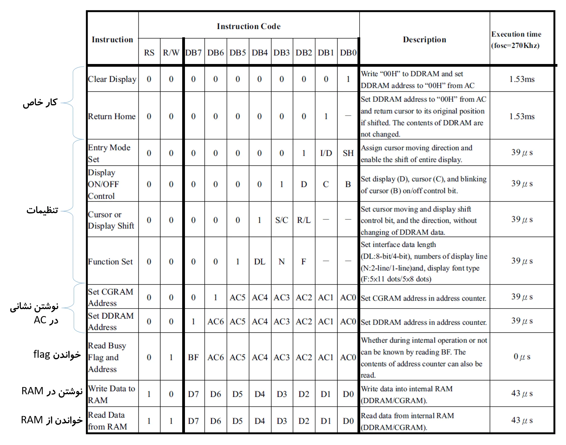 دستورالعمل ها یا instruction code های LCD کاراکتری