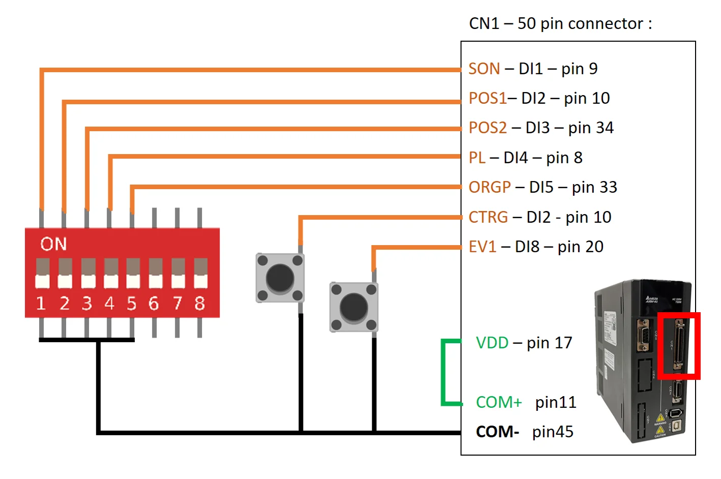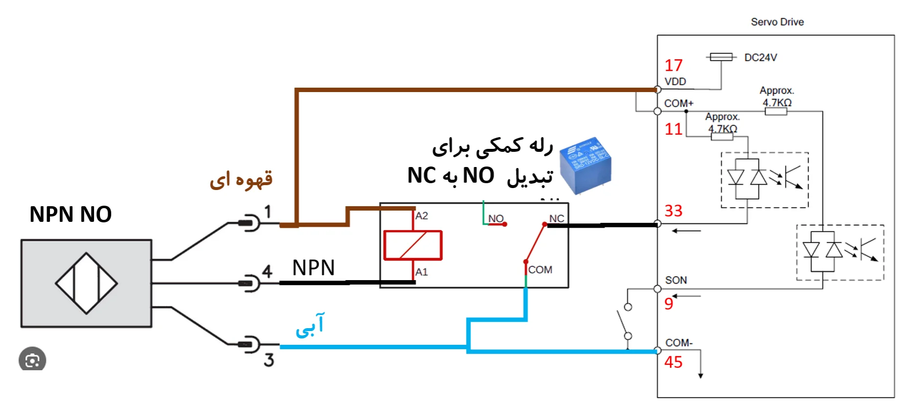 چون پایه های سروو درایو برای روشن شدن باید به زمین بسته شوند، باید حسگر NPN بکارگرفت، چون PNP نمیتواند به زمین ببندد و تنها میتواند به VCC ببندد. همچنین چون پایه های NL و PL ساده-بسته هستند، باید حسگر NPN NC بکارگرفت، چون من حسگر NO دارم، یک رله ی کمکی بکارمیگیرم، و با حسگر رله رو ، و با رله پایه ی سروو درایور رو روشن میکنم.