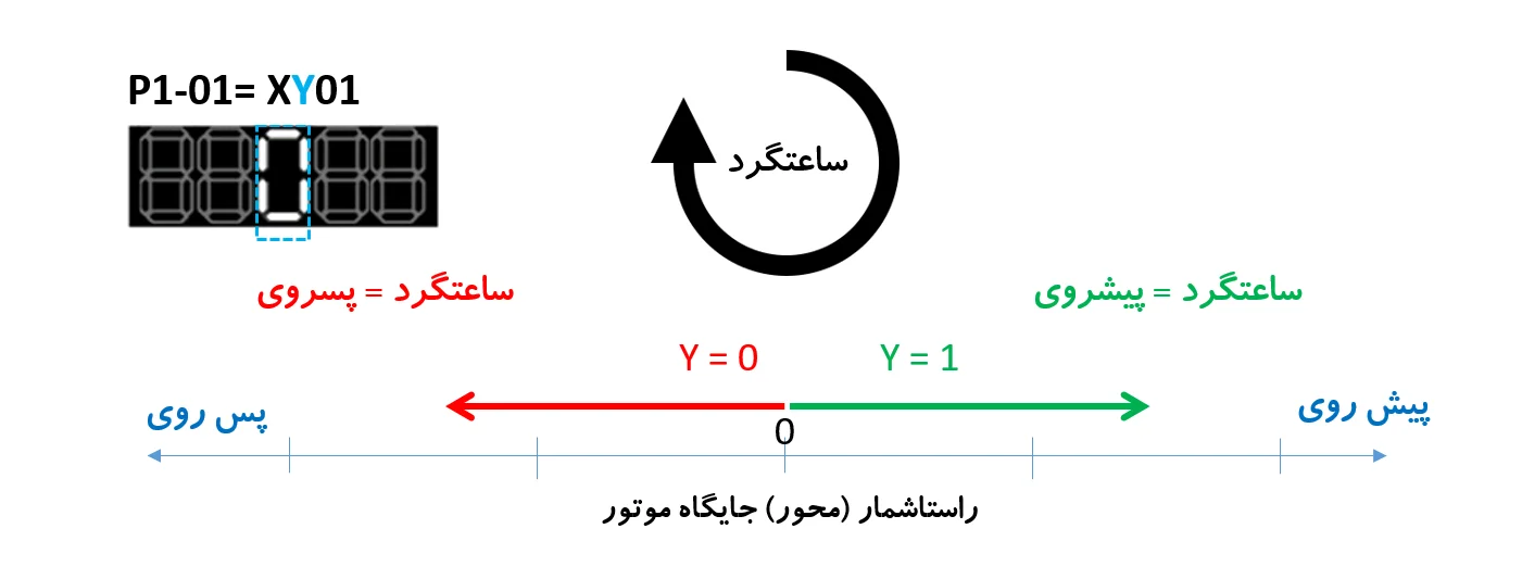 با صدگان پارامتر P1-01 گزینش می شود که پیشروی ساعتگرد یا پادساعتگرد باشد.
