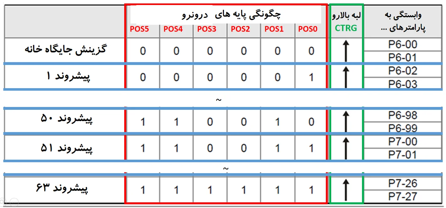 - پارامتر ویژگی دهی پیشروند گزینش جایگاه خانه P6-00 و پارامتر داده P6-01 است.