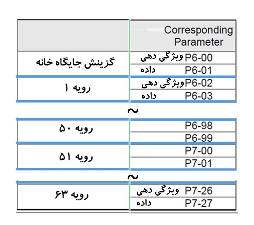 - پارامتر ویژگی دهی پیشروند شماره یک P6-02 و پارامتر داده P6-03 است.