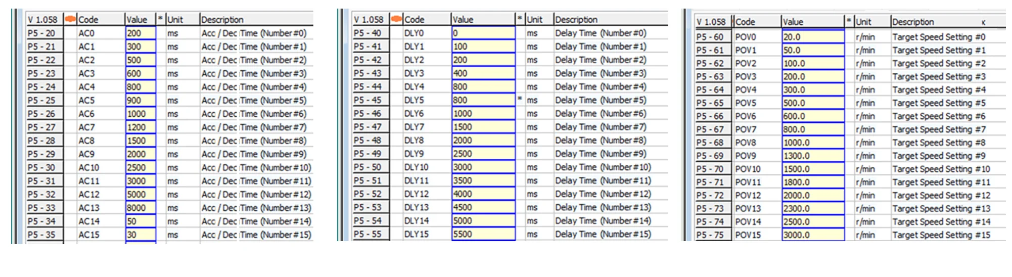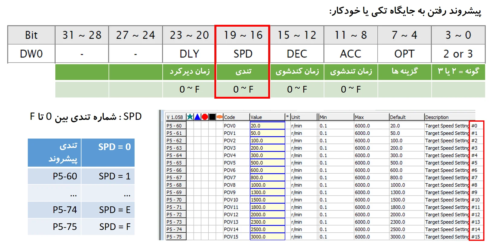 - 16 اندازه ی تندی در 16 پارامتر ( P5-60 تا P5-75 ) نوشته میشود. برای گزینش تندی برای هر پیشروند باید با نوشته شماره ای میان 0 تا 15 در بیت های SPD=0~F یکی از این پارامتر ها گزینش شود.