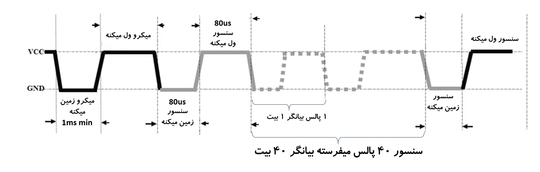 پروتکل ارتباطی این سنسور 1-wire هست ، و داده روی یک سیم جابجا میشه ، این سیم هیچ وقت نباید به VCC بسته بشه و تنها دو حالت داره: