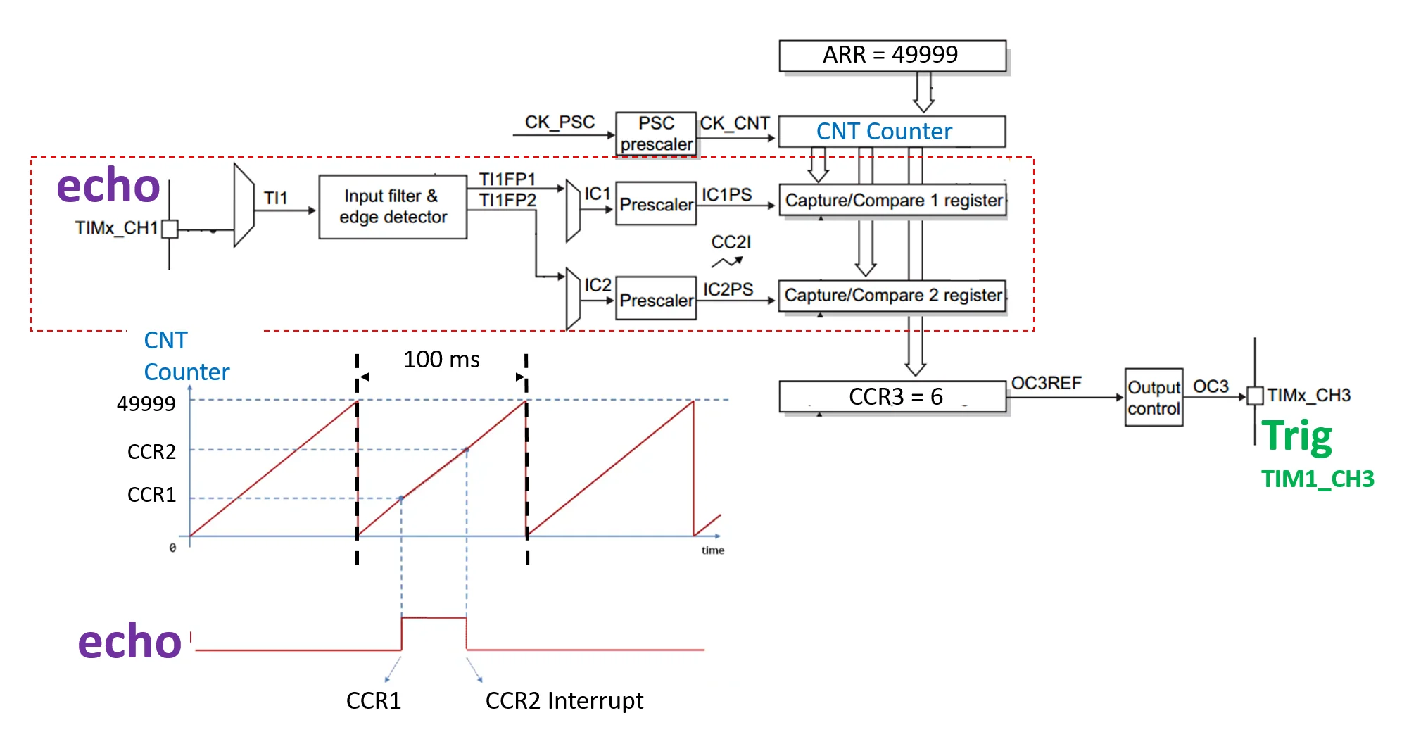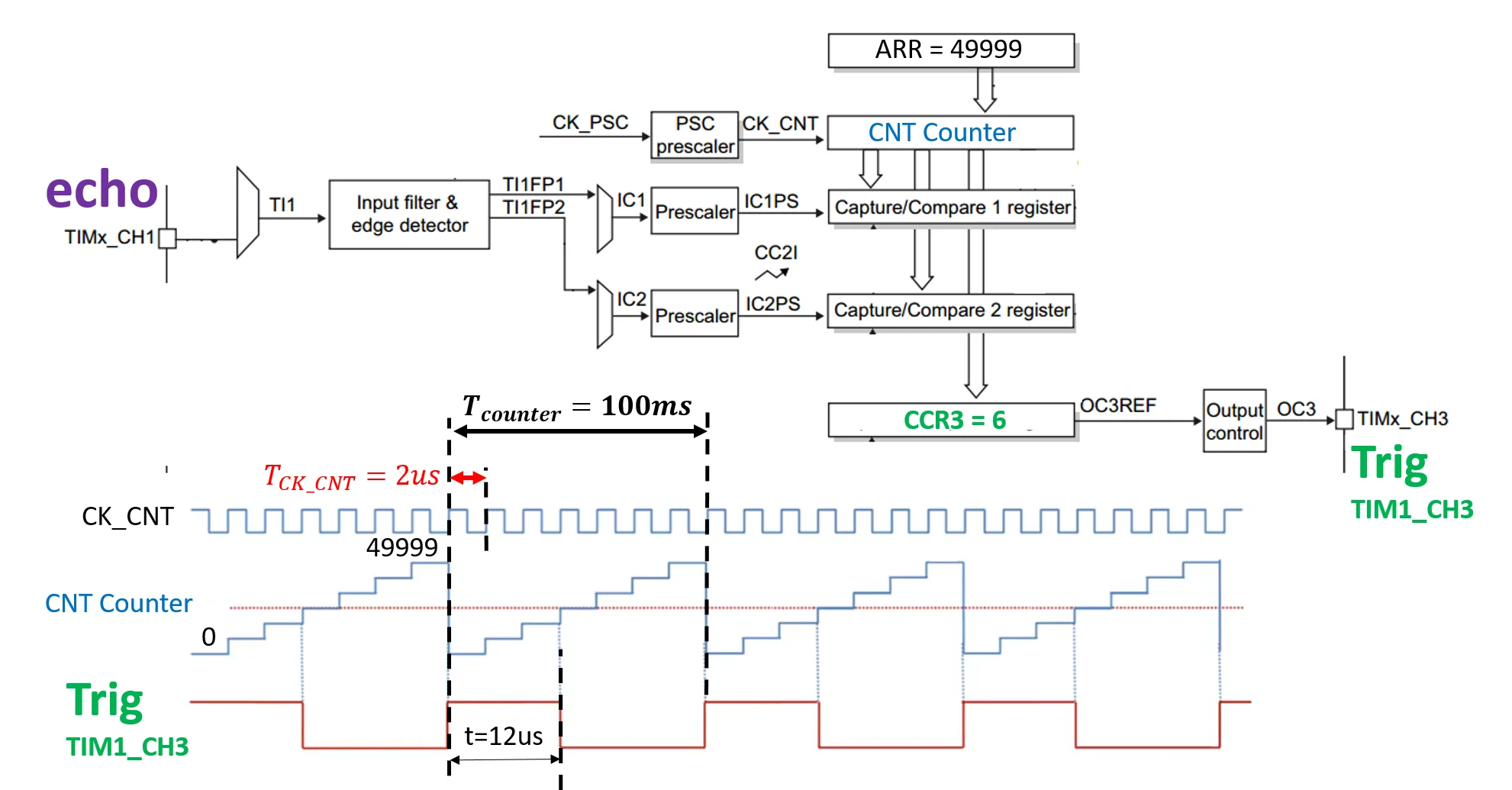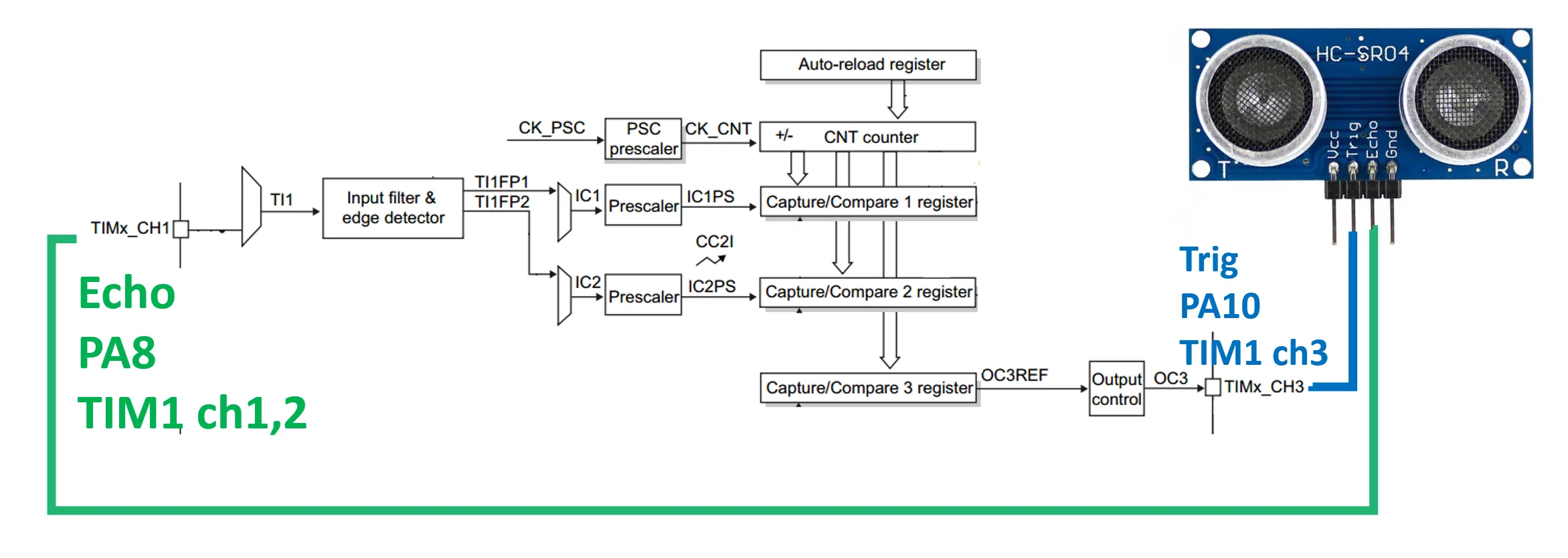 کانال 3 تایمر ، جهند ( پالس ) تریگر رو میفرسته و کانال های 1 و 2 هم هنگامی که لبه روی پایه ی اکو رخ میده ، اندازه ی شمارنده ( رجیستر CNT ) رو برمیدارند ، در اینتراپ ( بازداری ) کانال 2 تایمر ، با کم کردن اندازه ی CCR1 از CCR2 زمان یک بودن جهند اکو بدست میاد .
