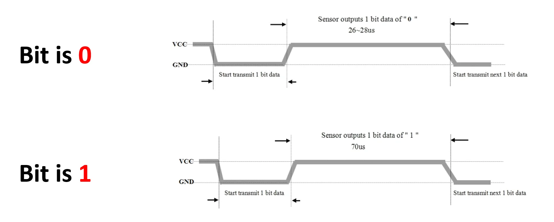 • اگر زمان یک بودن پالس 26-28us باشه ، بیت 0 توسط سنسور DHT22 فرستاده شده .